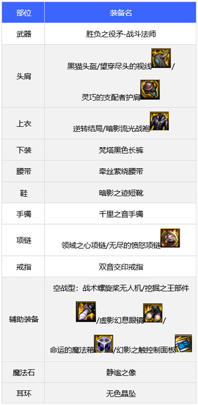 辅助装备:挖掘之王部件/虚影幻息眼镜/命运的魔法箱/空战型:战术螺旋桨无人机
