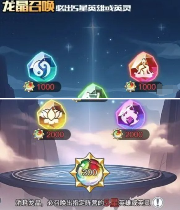 1、龙晶能量可以在龙晶召唤中使用,然后就能获得指定三阵营中的随机5星英雄。